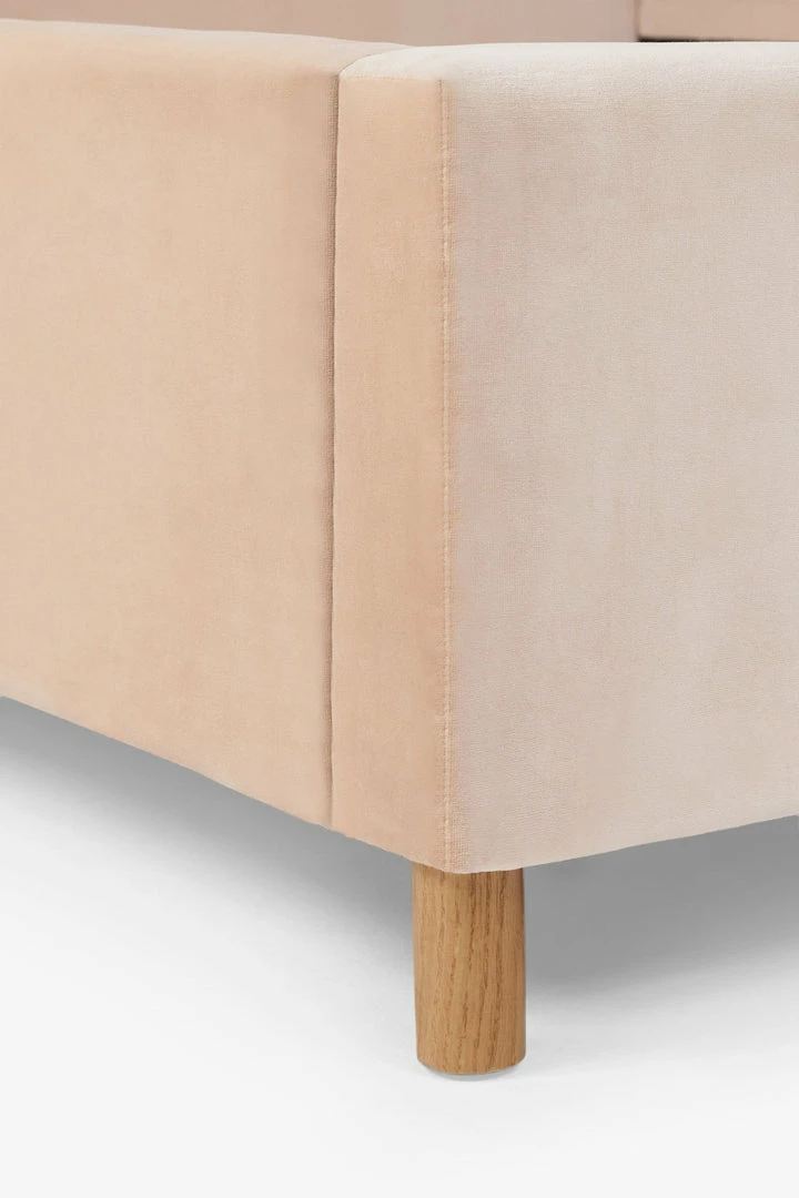 Our Solene Bed generates a lot of visual impact with its softly curved silhouette and textured upholstery. Wrapped in fabric and finished with oak wood legs, this bed frame’s modest headboard height makes your room appear more spacious. Round off its look with all-white bedding and muted, tonal accents.