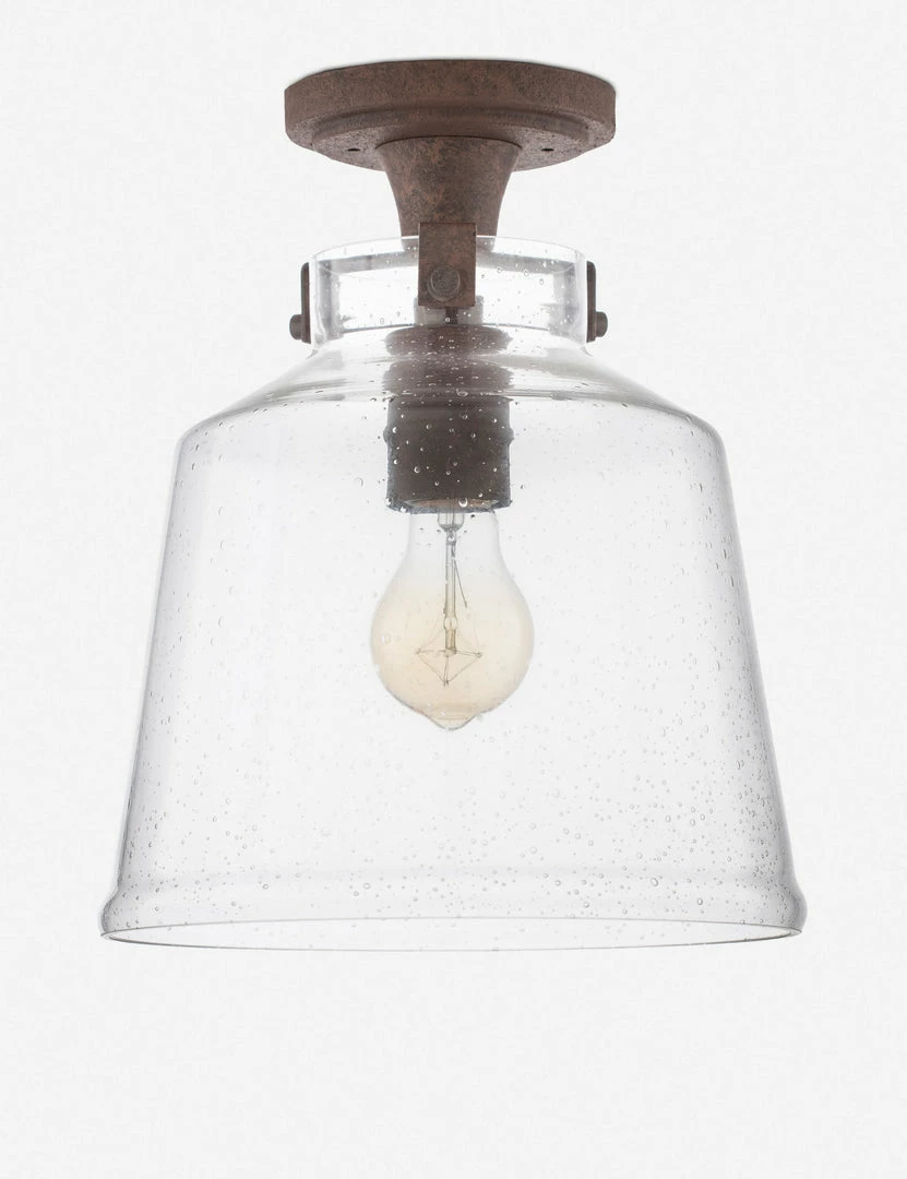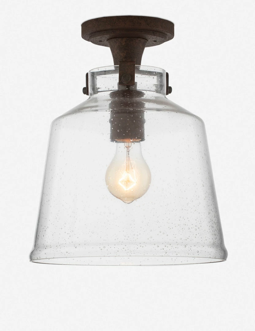 Taking a page from traditional style, this bronzed pendant features a bell-shaped glass shade, complete with bubbles and imperfections to add to the vintage-inspired look.