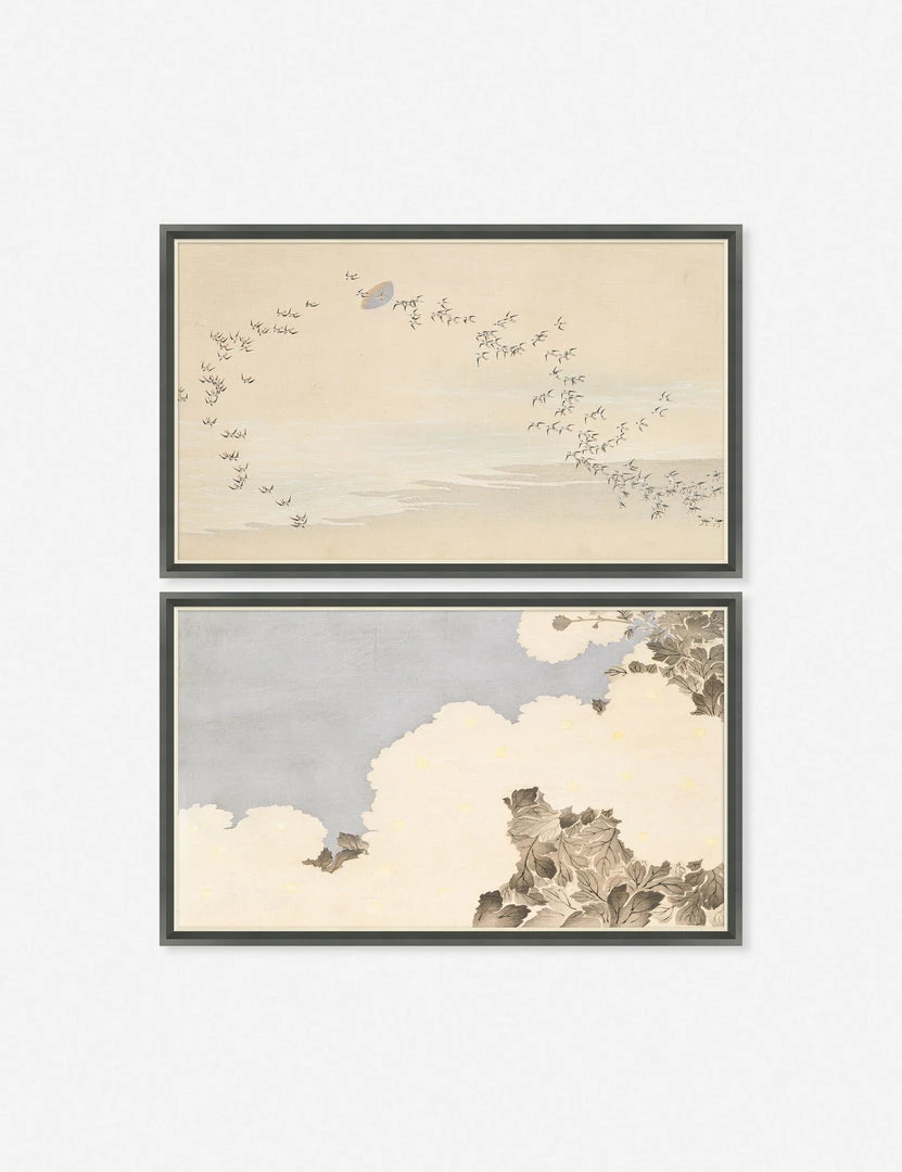 A set of tranquil skyscapes sit in quiet conversation in this diptych wall art set. The first image features a flock of birds in flight and the second a botanical canopy—both capture delicate movement with a sense of tranquility and stillness. Create a striking art wall moment in your bedroom or living space with this distinctive vertical arrangement.
