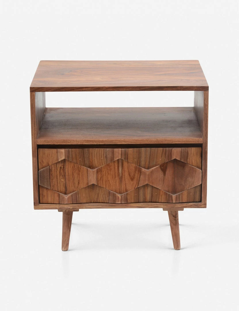 With mid-century modern inspiration, this sheesham wood nightstand blends retro and contemporary style. Featuring an open shelf and one-drawer design with intricate wood detailing, plus tapered legs to complete the look.