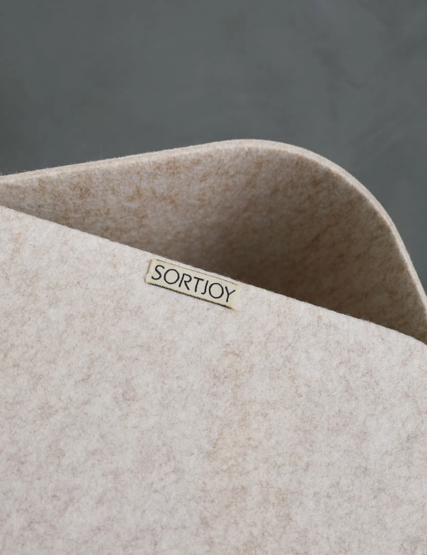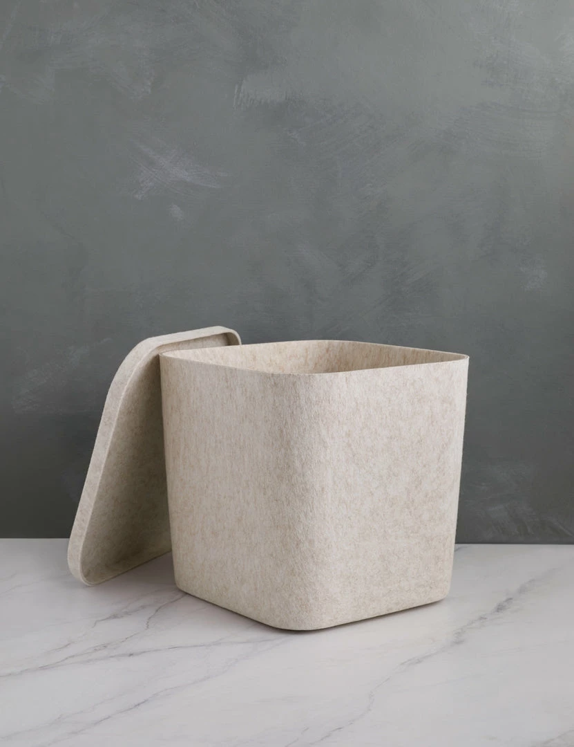 A simple, clean look in a sturdy felt construction. This versatile bin’s solid fabric form is ideal for bulky items like books or shoes or storing clothes and linens and can fit almost any space. We suggest using it in an entryway, living space, or child’s bedroom. With a flat lid, this organizing bin can stack and offer unobtrusive storage from a family room to child’s bedroom.