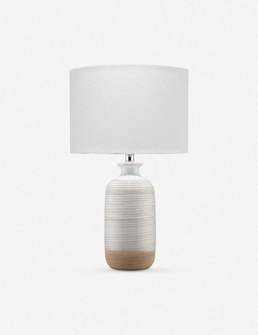 With a scored texture and two-tone finish that pairs a white glaze with the raw natural base, this balanced table lamp offers an elevating accent for a laid-back aesthetic. Topped with a white drum shade, this versatile table light will style blissfully into a modern bedroom or living space with understated appeal.