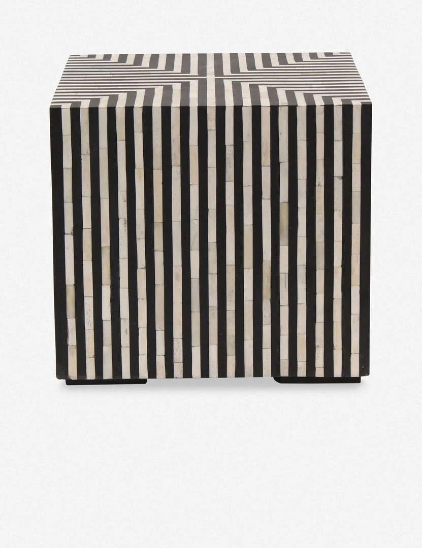 A sleek cubic form comes alive with a bold deco veneer in this side table. The contrast of the vibrant geometry creates striking impact in an eye-catching design. Pair this black and white end table with our Trendyl Coffee Table or style for a unique accent in an eclectic space.