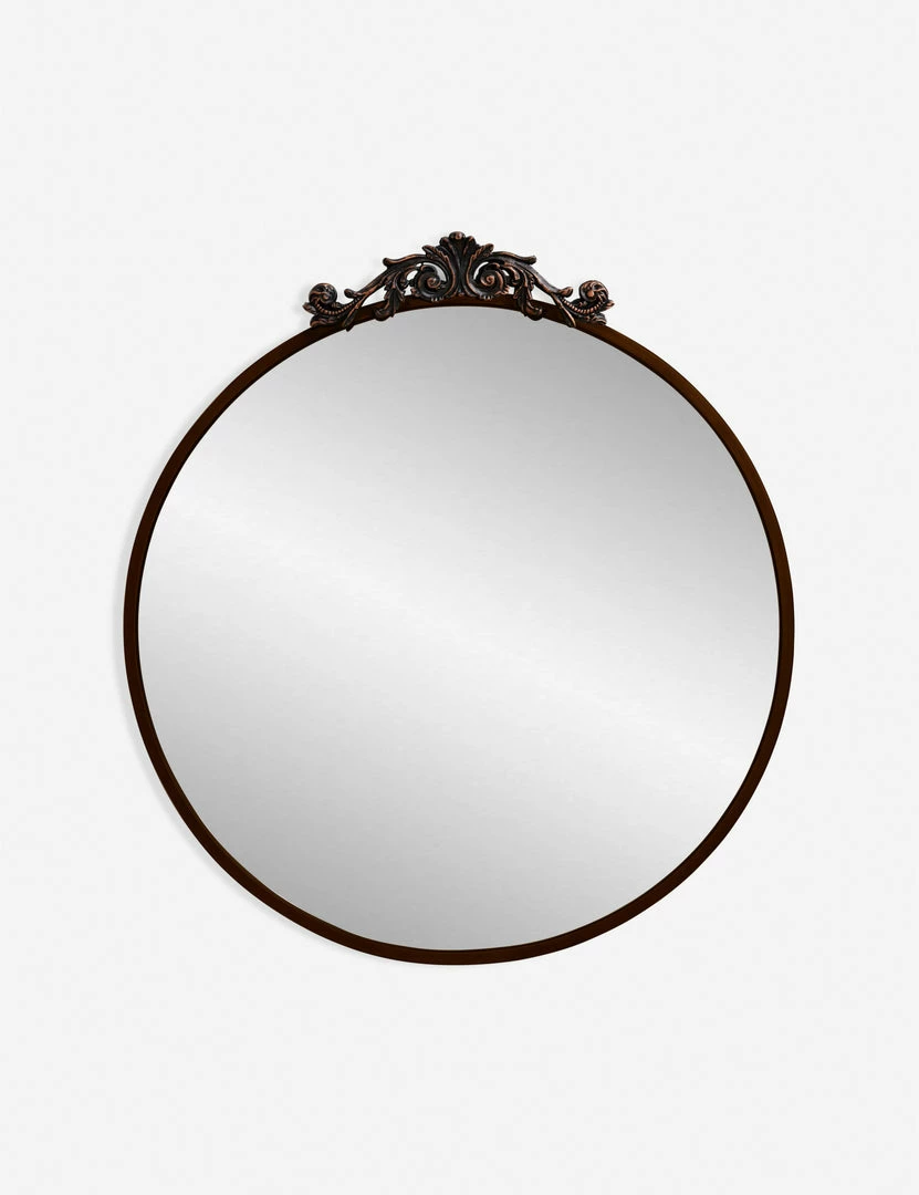 A large and ornate round mirror with impressive style. This decorative mirror features traditional vintage-inspired scroll detailing atop a metal frame, giving this timeless design an on-trend look perfect for tying together a transitional aesthetic.