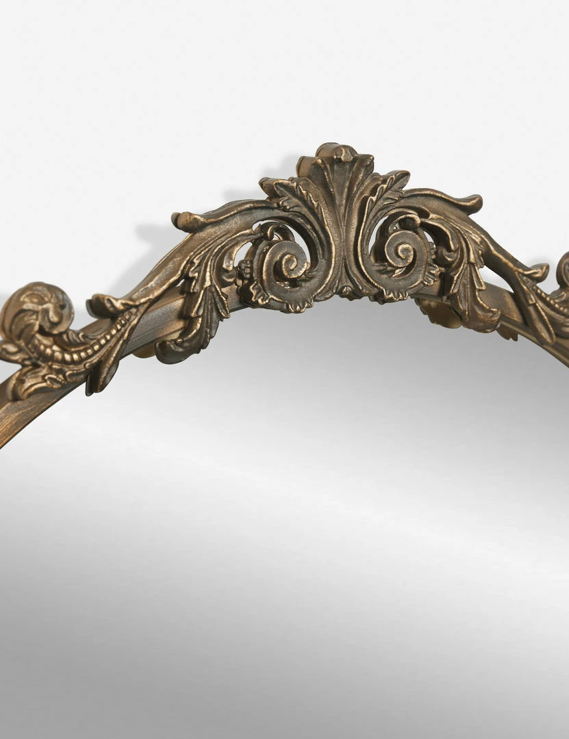 A large wall mirror with impressive style in a slender design. This curved mirror features a flat bottom edge and traditional scroll detailing at the apex of the metal frame, making it the perfect accent mirror to add a bright new dimension to a gallery wall or bathroom.