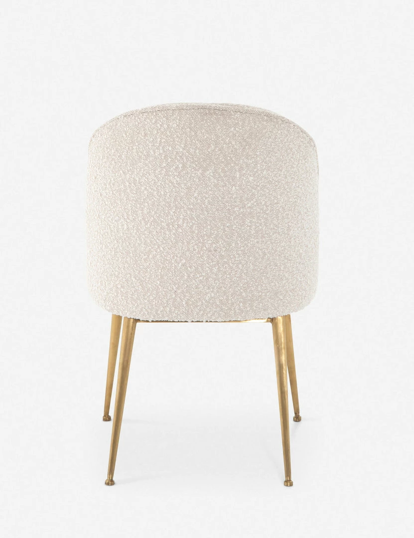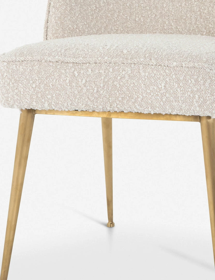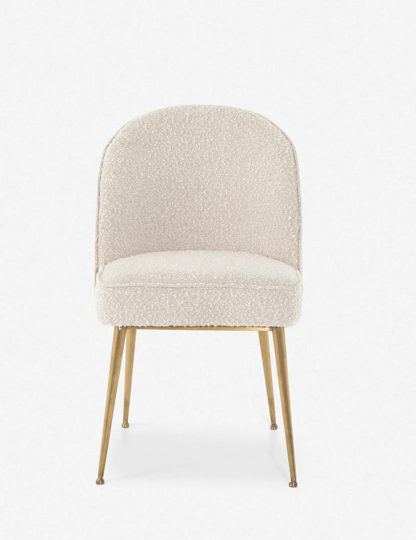 The delicate curving lines of this chic dining chair are reflected in the textural bliss of the cream boucle upholstery. Satin brass hairpin legs add a polished touch and offer deco undertones. Style this dining room chair in a set for a refined dining look or as an accent chair in a home office or living space.