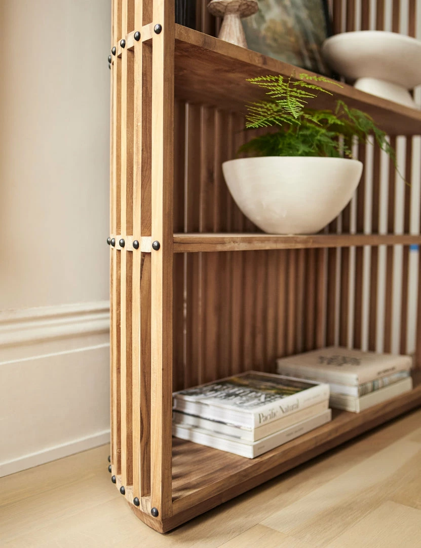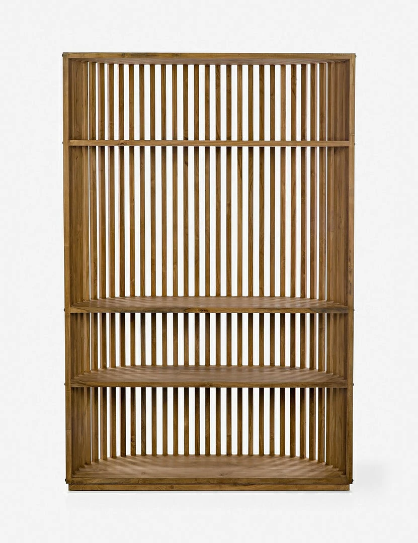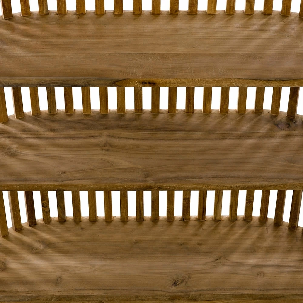 Teak slats form a curved half-circle shape in this showstopper of a bookcase, featuring round metal accents and warm wood tones throughout. Plenty of shelving makes this tall bookcase as practical as it is unique.