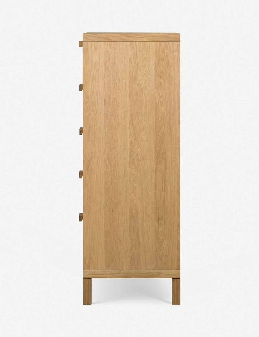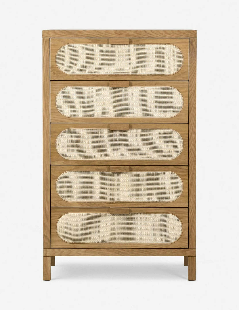 This wooden dresser brings transitional elements to the forefront of your bedroom, thanks to a wicker caned oval on each drawer front. Featuring simple squared legs and drawer pulls, this tall dresser gives you some extra bedroom storage without sacrificing style.