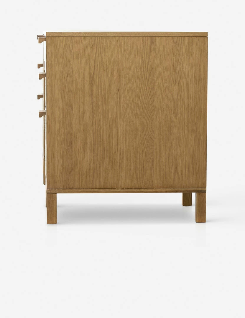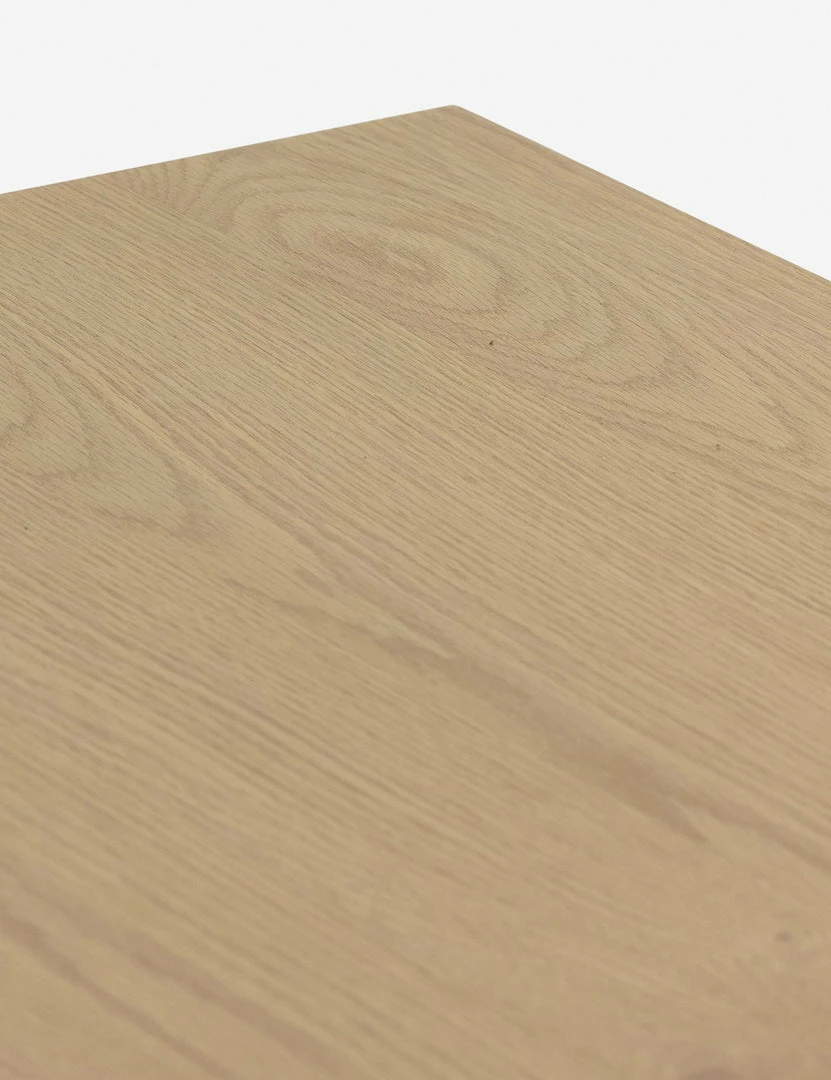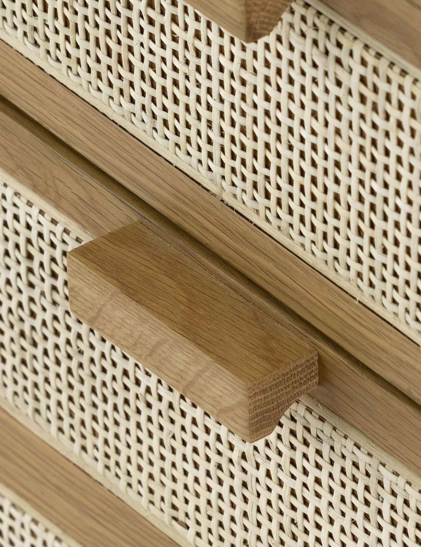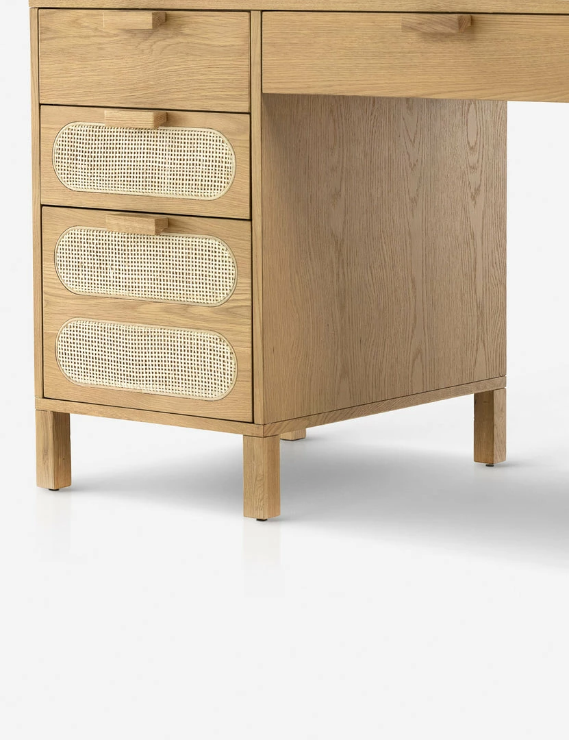 Honey-finished oak and oval-shaped cane paneling inspire transitional appeal in the Verna Executive Desk. With seven drawers—including two for file storage—plus rear cutouts for cord management, this light wood desk is set for effortless warmth in your home office.