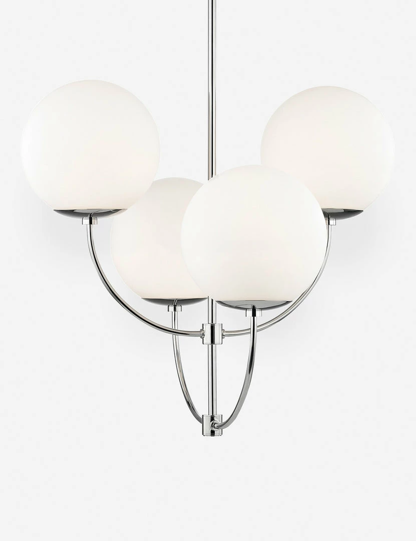 This unique ceiling light evokes an Art Deco feel, with four globe shades flowing out and alternatively staggered from its curved frame. Crafted from glass and polished nickel or antique brass finished metal, the shades’ opal matte finish softly diffuses light. We love this hanging ceiling fixture placed over a round dinner table, bar, or kitchen island.