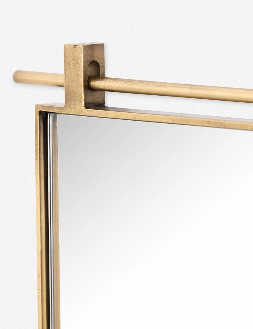 Suspended from a slim bar, this streamlined mirror strikes a look both polished and modern. This wall mirror offers a chic tone that will elevate your bathroom or living space with its burnished finish and versatile design.
