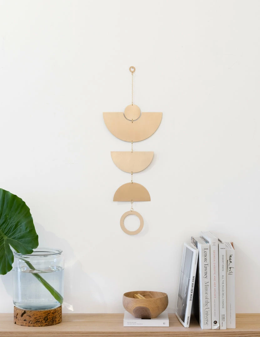 Circle & Line is an Austin-based design studio that produces elegant, unique decorative accents and understands the role these artful objects play in elevating the look of a space. A neat arrangement of suspended geometric shapes pair with a polished bronze finish. This eye-catching wall art design perfectly complements natural accents and house plants or can be floated as a sculptural element near an art wall gallery.