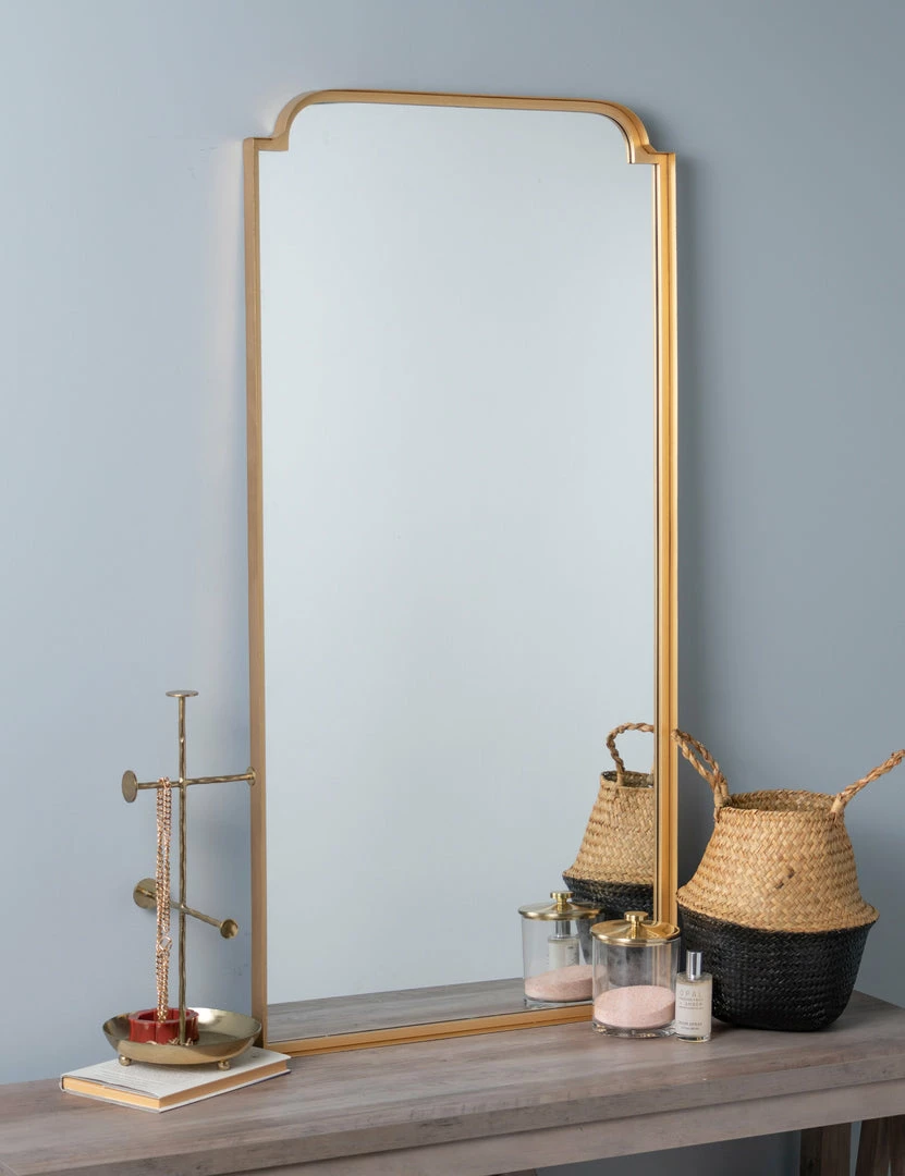 Folding classic style notes into a refined design, this gold framed mirror is the perfect finishing touch for an entryway transitional area. Style this mirror on a console table to amplify its height and inspire your space with a fresh dimension.