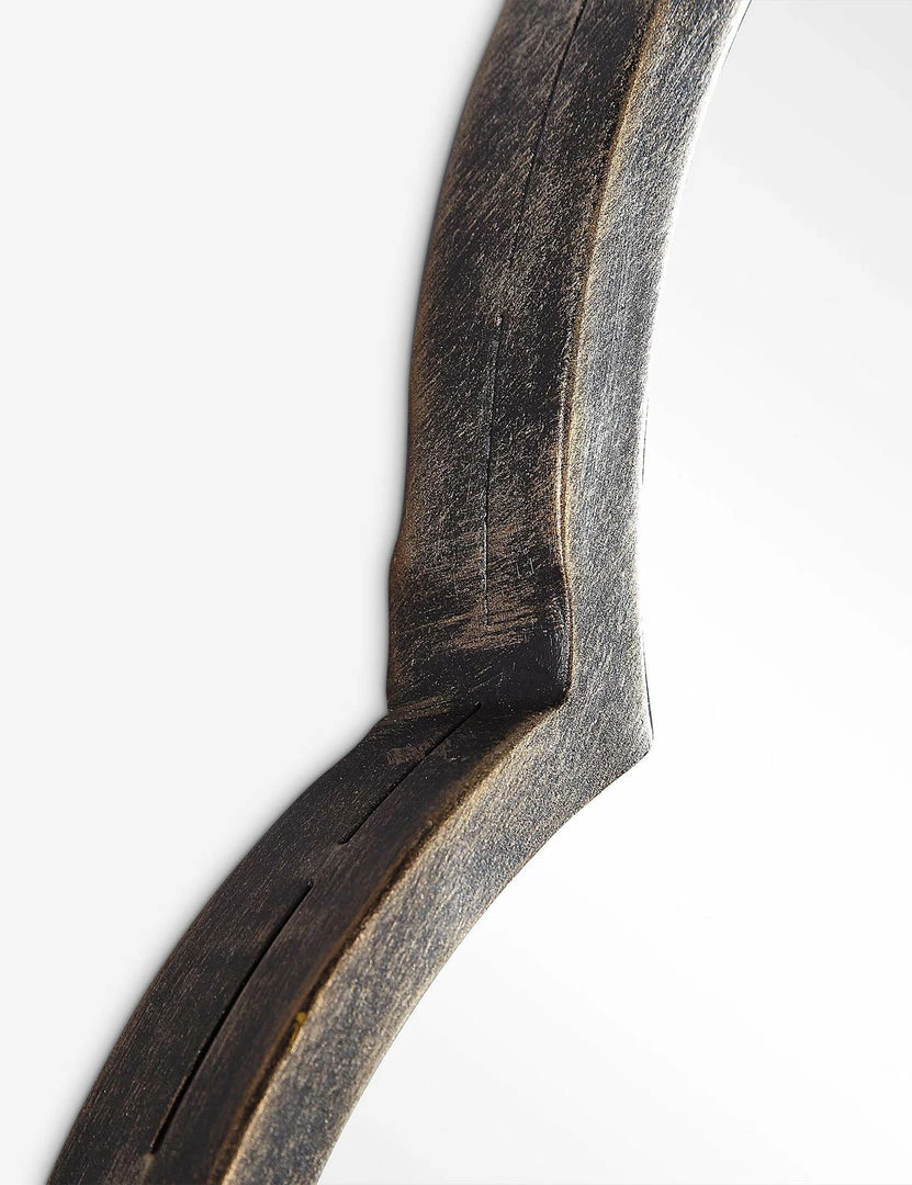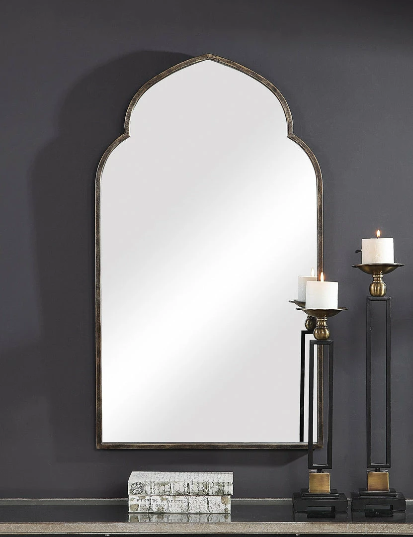 With its beautifully arched shape and an antiqued bronze finish, this decorative mirror looks like an exciting market find. The metal frame’s rich patina brilliantly reflects in the light, so we love the idea of placing this sculptural wall mirror above a mantel or console table.