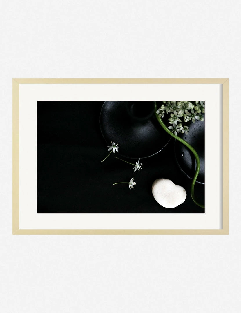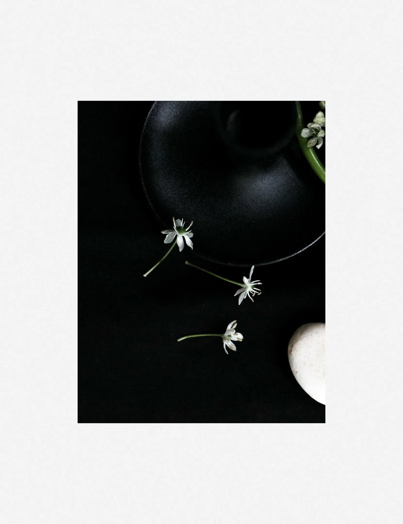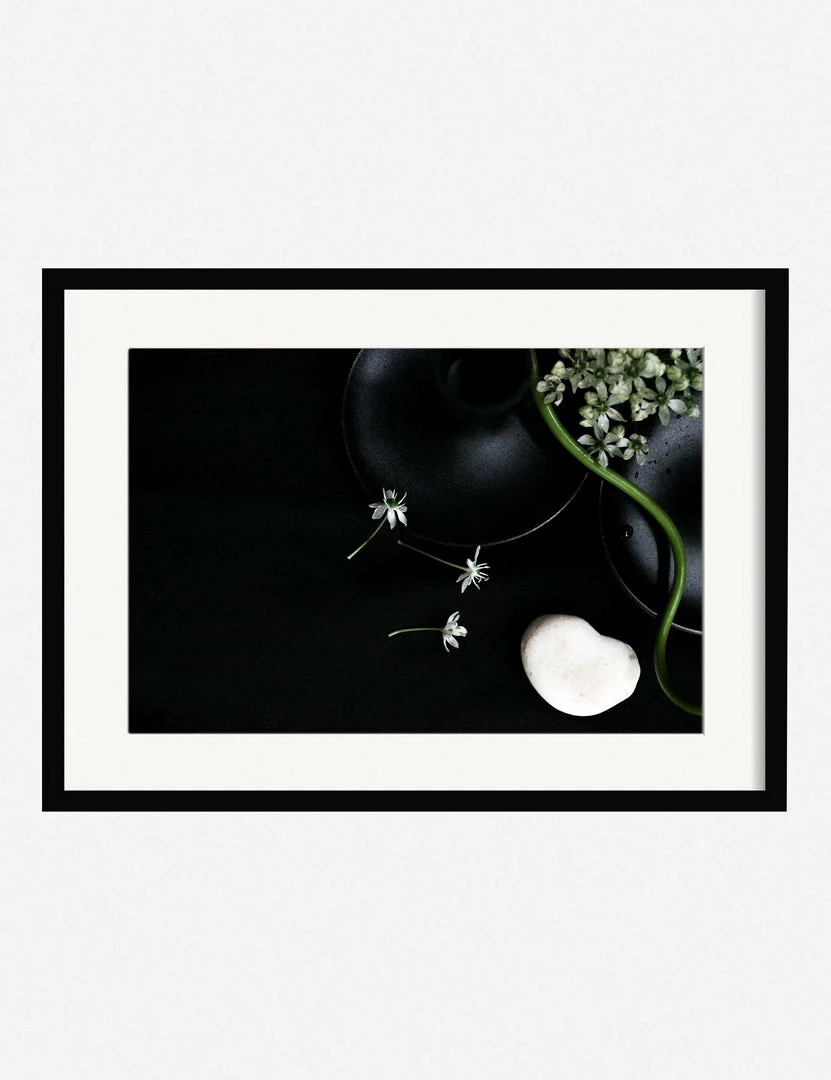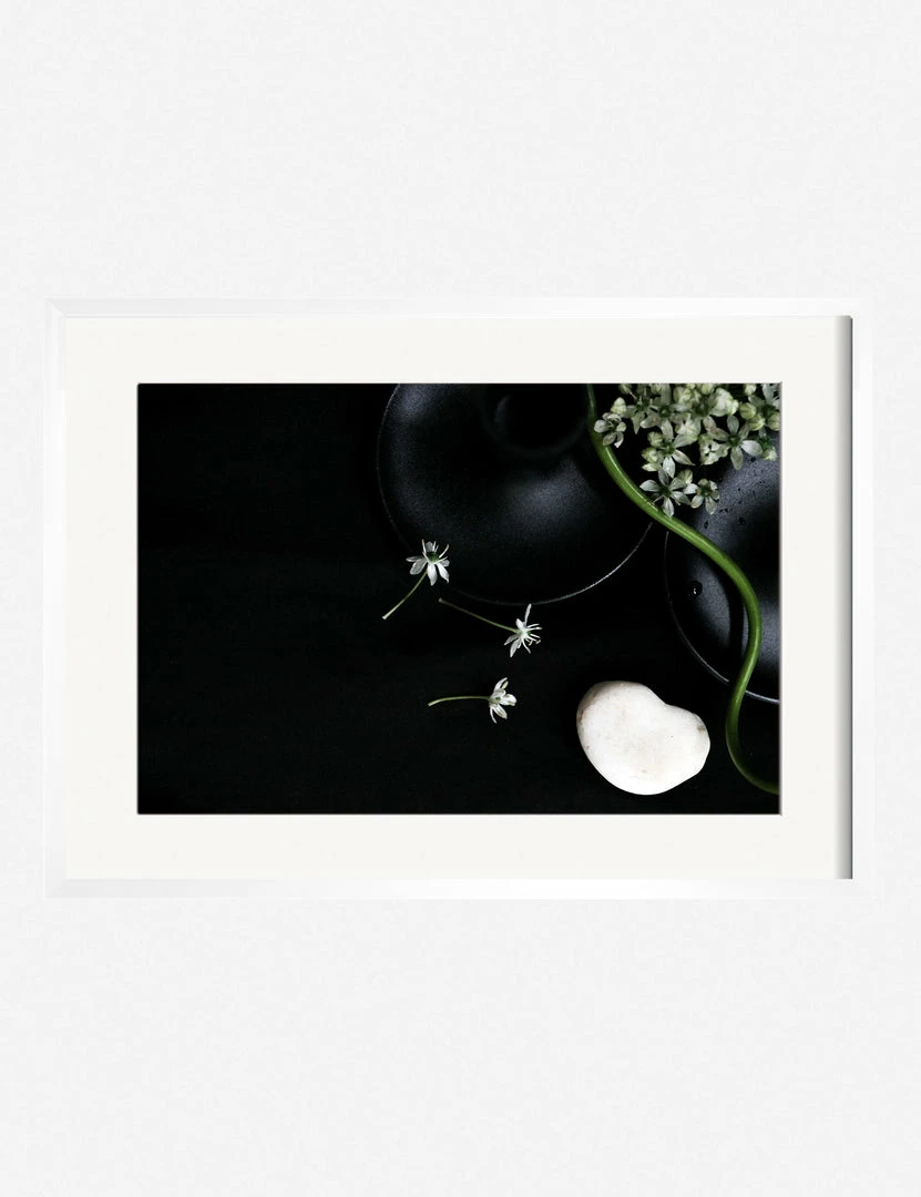 Winston-Salem-based multidisciplinary artist Ashley Johnson uses mixed media to create her staged portraits. The stark white and green flora contrasts with the heavy blacks and understated highlights in this deeply moody, tender arrangement. This wall art print was produced using archival inks to achieve long-lasting, true-to-color richness, outstanding resolution, and an even ink lay for a stunning gallery-quality addition to your art wall decor.