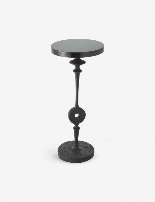 The Westleigh accent table offers a whimsical global look that plays with shape and texture. The pedestal base features cutouts and spiral shapes, with a heavily textured natural iron construction, topped with a round smooth black granite piece for a contemporary twist.